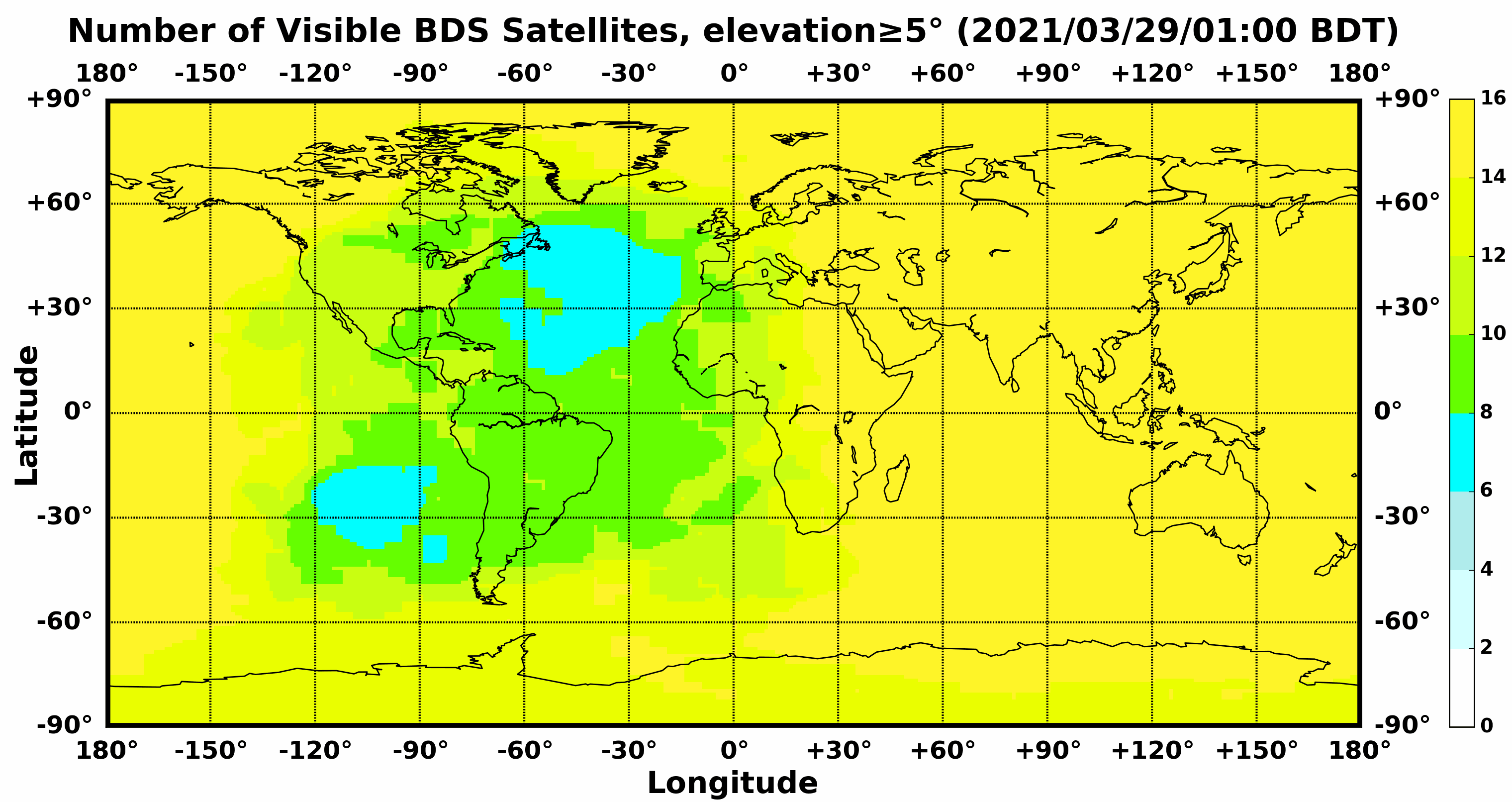 此处显示的是北斗卫星导航系统在全球任意地点可以看到的卫星数目,用不同颜色表示不同数值(颜色与数值的对应情况参见右侧的图例)。