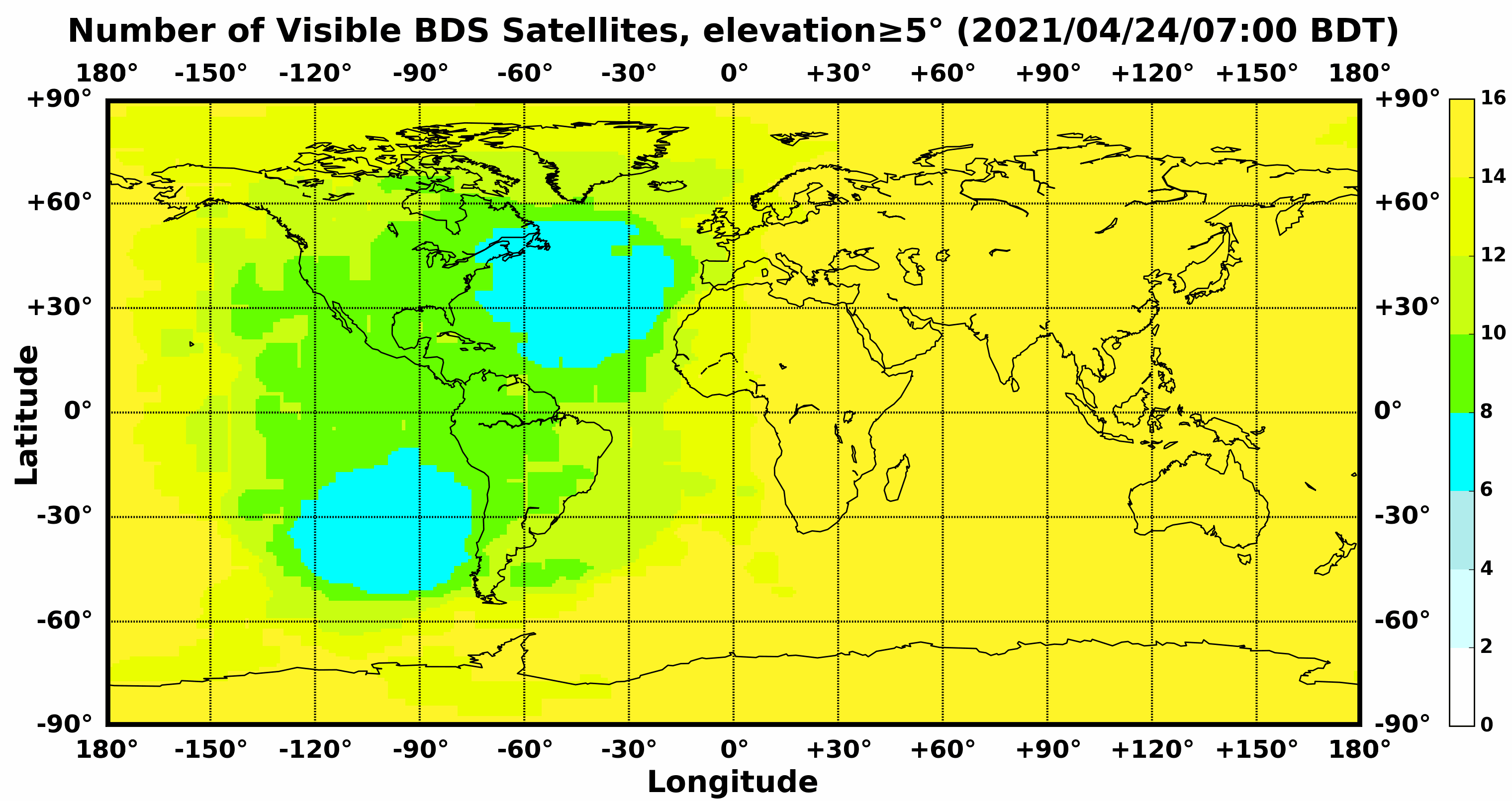 此处显示的是北斗卫星导航系统在全球任意地点可以看到的卫星数目,用不同颜色表示不同数值(颜色与数值的对应情况参见右侧的图例)。