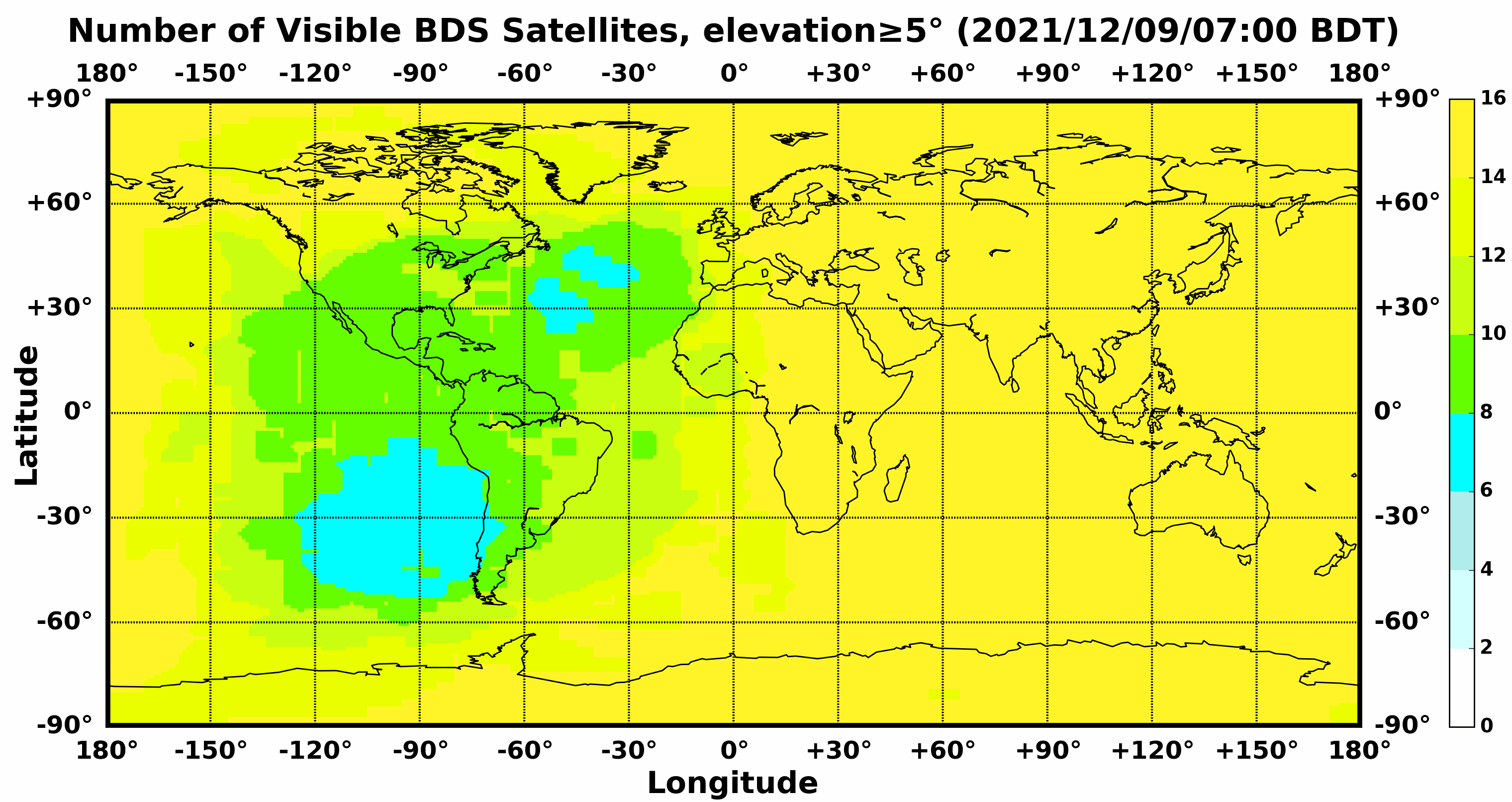 此处显示的是北斗卫星导航系统在全球任意地点可以看到的卫星数目,用不同颜色表示不同数值(颜色与数值的对应情况参见右侧的图例)。