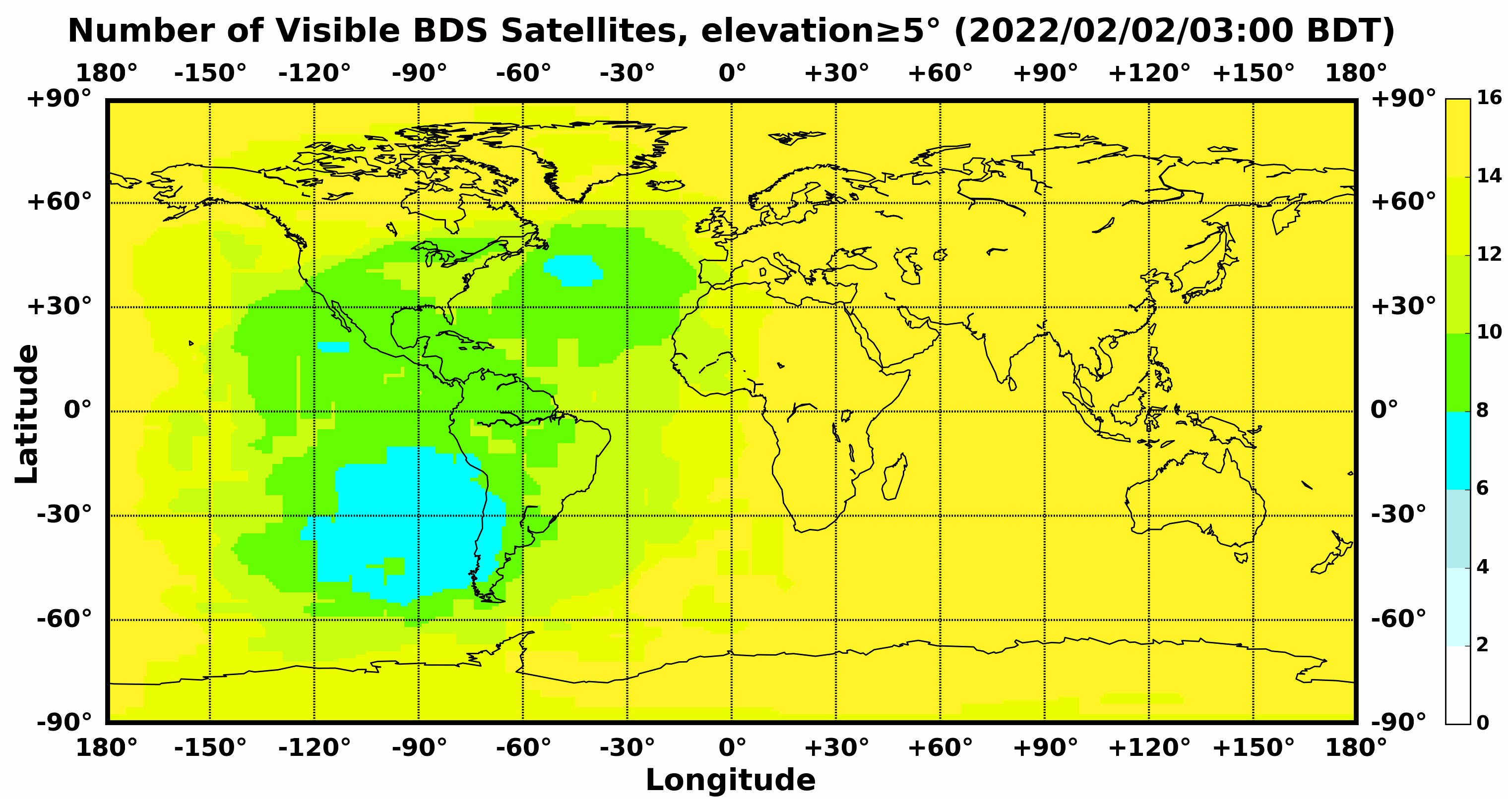 此处显示的是北斗卫星导航系统在全球任意地点可以看到的卫星数目,用不同颜色表示不同数值(颜色与数值的对应情况参见右侧的图例)。