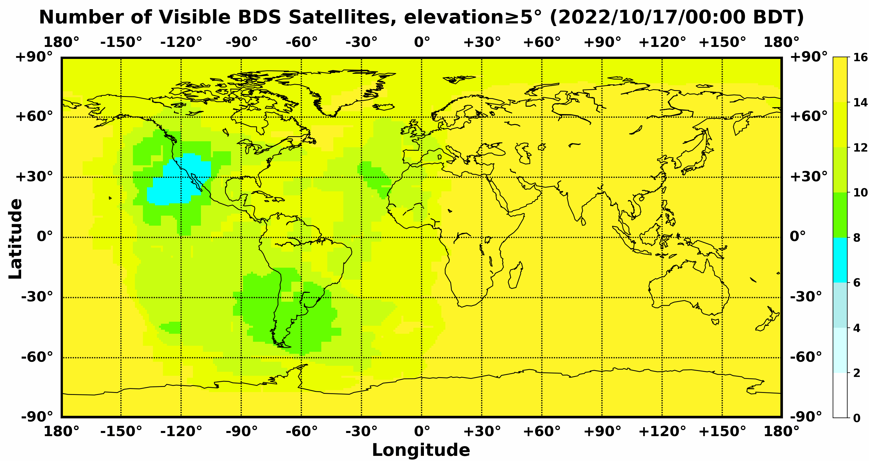 此处显示的是北斗卫星导航系统在全球任意地点可以看到的卫星数目,用不同颜色表示不同数值(颜色与数值的对应情况参见右侧的图例)。