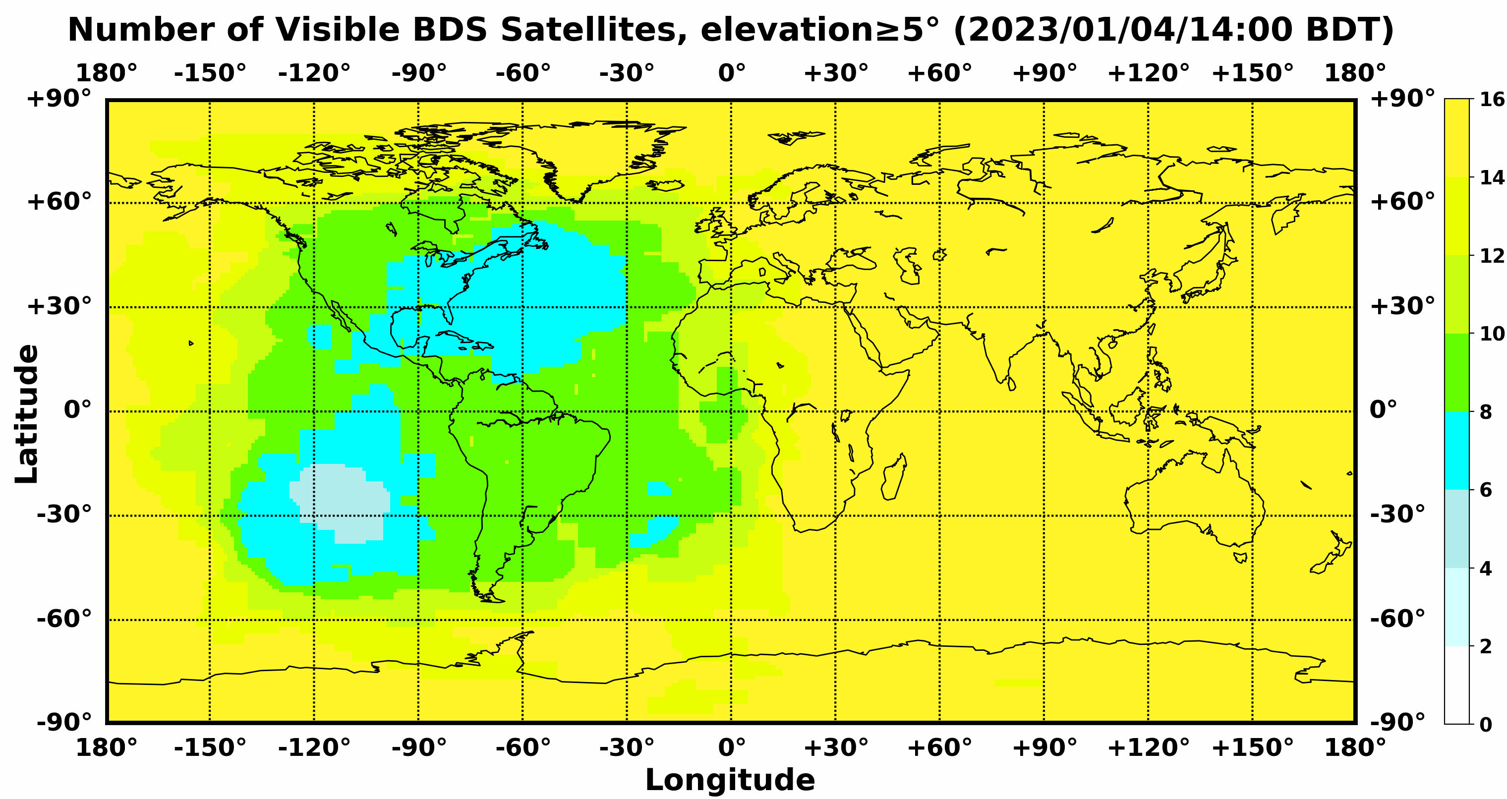 此处显示的是北斗卫星导航系统在全球任意地点可以看到的卫星数目,用不同颜色表示不同数值(颜色与数值的对应情况参见右侧的图例)。