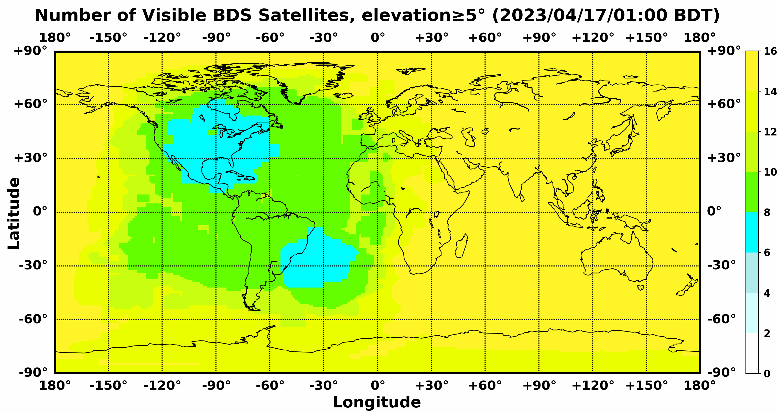 此处显示的是北斗卫星导航系统在全球任意地点可以看到的卫星数目,用不同颜色表示不同数值(颜色与数值的对应情况参见右侧的图例)。