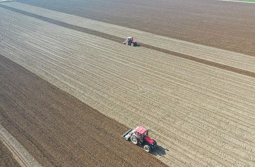 11月13日,河南周口高标准农田示范区内,带有北斗导航无人驾驶的“耙播一体机”在田间进行小麦秋播作业。