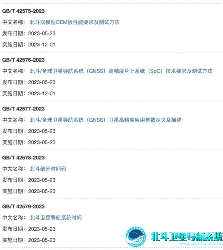 公告显示,北斗相关国家标准分别为《北斗双模型OEM板性能要求及测试方法》《北斗/全球卫星导航系统(GNSS)高精度片上系统(SoC)技术要求及测试方法》《北斗/全球卫星导航系统(GNSS)卫星高精度应用参数定义及描述》《北斗剖分时间码》《北斗卫星导航系统时间》。